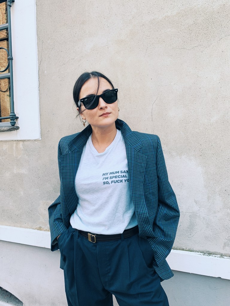 Amo lo stile francese perché mi rispecchia molto, ovvero semplicità nelle linee, nei colori e nelle forme. Prediligo look minimal ma con l’aggiunta di qualche pezzo ricercato, adoro il vintage e penso che la chiave della femminilità contemporanea sia un giusto compromesso con alcuni capi maschili, come capispalla e maglioni. Ricerco sempre l’unicità e l’affinità a distinguersi dalla massa, cercando in ciascuno la propria cifra stilistica per combattere una volta per tutte la dittatura del nero, l’omologazione e l’appiattimento.